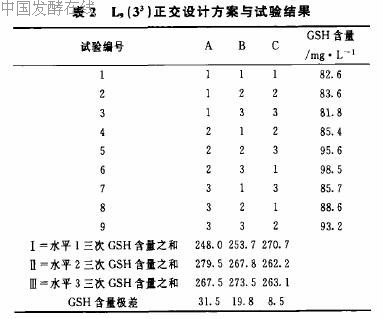 从表2中GSH含量的极差可以看出,甘油、半胧氨酸和KHZPO;三个因素对GSH产量的影响程度大小依次为:甘油浓度>半胧氨酸浓度>KH:PO、浓度,最优组合为AZB3Cl,即甘油309/L,半胧氨酸0.369/L,KHZPO;39/L。此条件下,重组酵母GSH产量为98.5mg/L,生物量为19.49/L。