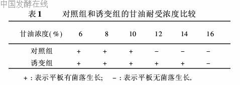 未诱变处理和经UV诱变处理后的XC-1-35菌株的单孢子悬液,采用梯度稀释后涂布于含不同浓度甘油的分离平板上,结果如表1所示。研究发现,未经处理的对照组在含12%以上甘油浓度的平板上无菌落生长,其甘油耐受浓度为10%;经UV诱变处理的诱变组在含14%甘油浓度的平板上还可生长出少量呈光秃型的小菌落,并且随着平板中甘油浓度的增加,菌落的生长速度也随之减慢,其培养时间由对照的9d延长到13d。