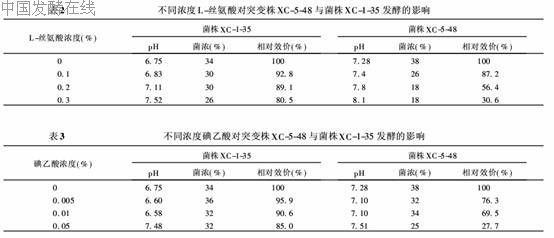 (2)碘乙酸的影响 将突变株XC-5-48与菌株XC-1-35的种子培养液分别接种在含不同浓度碘乙酸的发酵培养基中,进行摇瓶二级发酵,发酵96h后放瓶,测定pH、菌浓、效价,以在不含碘乙酸的培养基中发酵为对照,结果见表3。从表3可知,碘乙酸对出发菌株XC-1-35的生长和产物合成影响均较小。对突变株XC-5-48而言,低浓度的碘乙酸对生长和产物合成有较显著的抑制作用,随着碘乙酸加量的增加,其抑制作用增强,当浓度达到0.05%时,菌浓下降34.2%,效价降低70%以上,表现出对菌株生长和克拉维酸生物合成都有强烈的抑制作用。据报道碘乙酸是酶活性中心含有-SH基团的膜透性酶的灭活剂。试验表明,碘乙酸能强烈抑制突变株XC-5-48的GTS的转运甘油能力,造成产量大幅度下降。