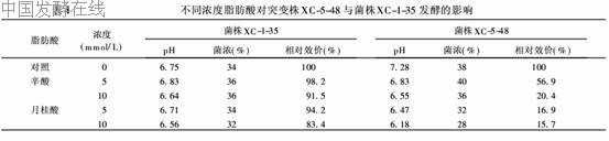 试验中将突变株XC-5-48与菌株XC-1-35的种子培养液分别接种在含不同浓度辛酸(八碳酸)和月桂酸(十二碳酸)的发酵培养基中,进行摇瓶二级发酵,发酵96h后放瓶,测定pH、菌浓、效价,以菌株在不含脂肪酸的培养基中的发酵结果为对照(表4)。从表4可知,脂肪酸对出发菌株的生长和克拉维酸生物合成有一定的影响,对突变株XC-5-48的克拉维酸生物合成表现出强烈的抑制作用。加入5mmol/L的八碳酸(辛酸)使效价较对照下降43%,而加入5mmol/L的十二碳酸(月桂酸)则使效价下降83%,表明随着脂肪链长度的增加,其对克拉维酸生物合成的抑制作用也随之增强。