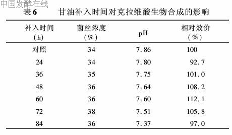 当基础培养基中甘油浓度超过一定范围时可抑制克拉维酸的生物合成,但甘油又是克拉维酸合成的直接前体,合成过程中需要甘油存在。为解决这一矛盾,试验中采取了发酵过程中补加甘油的方法。即发酵培养基初始甘油浓度为1.5%,在摇瓶发酵至24、35、48、60、7和84h时分别补入1.0%的甘油,继续培养至96h放瓶,以不补加甘油为对照,考察甘油补入时间对克拉维酸生物合成的影响,结果如表6所示。