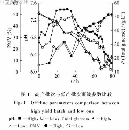 2.1 高产批次与低产批次基本发酵参数的比较在比较高产批次与低产批次的离线数据时发现它们前期离线参数的变化非常类似。如图1所示,80h前总糖浓度的变化基本重合,也就是碳源的利用速率基本一致,其他还原糖、PMV等的过程曲线也有类似现象。真正体现出差异的除了产素能力以外,就是pH值,低产批次一直要低于高产批次。我们进