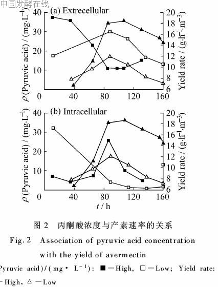 为了进一步了解阿维菌素发酵过程的特性,测定了实际生产过程中几个不同发酵批次4种有机酸在胞内与胞外的积累情况,并与产素速率进行关联性分析,结果发现高产批次与低产批次有机酸的代谢情况差异明显。