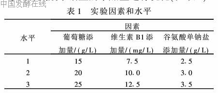 根据资料中影响脱落酸产量的因素,利用L9(34)正交实验对培养基配方中葡萄糖、维生素B1及谷氨酸单钠盐的添加量进行优化(见表1).