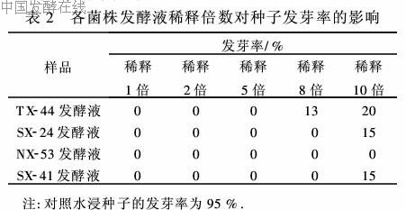 从分离出的57株真菌中初筛出4株脱落酸产生菌TX-44、SX-24、NX-53和SX-41,分别将上述菌株的发酵液稀释,检测对莴苣种子发芽抑制情况,结果见表2.