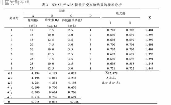 菌株NX-53产ABA特性正交实验结果的极差分析如表3所示.
