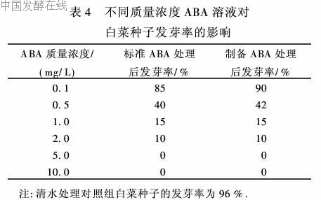 本研究制备的脱落酸及脱落酸标准品对白菜种子发芽的影响情况见表4.由表4可见,本研究制备的脱落酸与标准脱落酸相比对白菜种子发芽率的抑制情况基本相同,表明本研究制备的脱落酸活性较高.