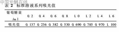 测出发酵液总糖含量的吸光值后,根据标准曲线的回归方程计算出总糖稀释液的浓度X值,从而可知发酵液中总糖含量(见表3),总糖含量(g/ml)=10 X%。