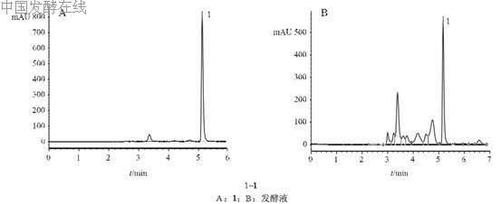 1:HPLC测定。色谱条件:色谱柱KromasilC18柱(4.6mm×250mm,5μm),流动相乙腈-水(4∶96),检测波长207nm,流速0.8ml/min。发酵液和1的色谱图见图1。残糖:采用葡萄糖-谷氨酸分析仪测定。