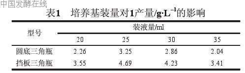 在500ml圆底三角瓶和带有挡板的三角瓶中分别装入20、25、30、35ml发酵培养基进行发酵,60h后测定发酵液中1含量,结果见表1。
