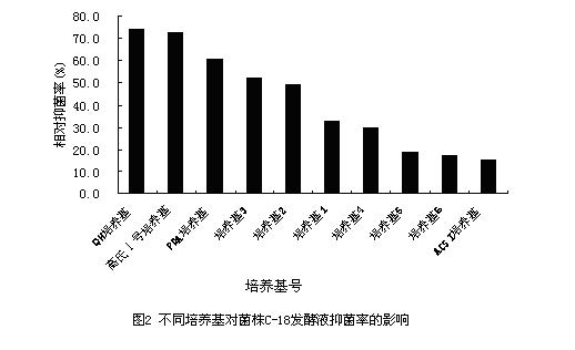 将C-18菌株接种在不同培养基中,发酵培养6d后测发酵液对稻瘟病菌的抑菌情况,结果见图2。从图中可以看出,C-18菌株在QH培养基中发酵液的抑菌率最大,因而产生的抑菌物质可能也最多。说明本试验中QH培养基最适合C-18菌株产抗菌物质。