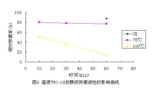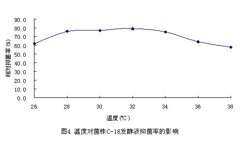 从图中可以看出,在选用的各种温度条件下,C-18菌株发酵液对稻瘟病菌均有抑菌活性,但在