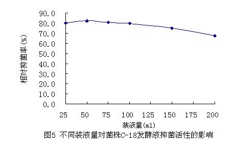 从图中可以看出,不同装液量对C-18菌株产抗生素具有不同的影响,随着供养量增加,抑菌率增大,在250ml三角瓶中加入培养基50ml时,发酵液的抑菌活性最大,抑菌率达82.5%,而装液量为25ml时,发酵液的抑菌率反而减小,可能是因为装液量过少,培养基粘在瓶壁上,真正用于菌体生长的营养成分不足,导致抑菌活性受影响。由此试验结果可以确定最佳的装液量为50ml。