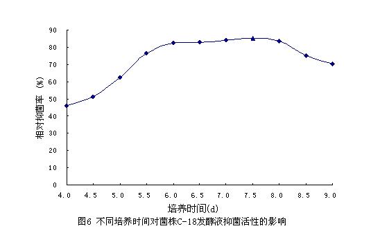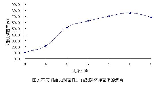从图中可知,当pH为8.0时,相对抑菌率最高;在中性至弱酸弱碱性条件下,发酵液对稻瘟病菌的相对抑菌率仍较高,说明中性和弱酸弱碱性环境均适合C-18菌株产抗菌物质。