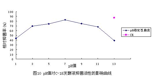 从图中可以看出,在极酸和极碱(pH值小于3、大于11)条件下,发酵液的抑菌活性下降;而在中性和酸碱条件下(3<pH<11),抑菌活性都很稳定,与对照相差不大,说明发酵液的酸碱稳定性较好。