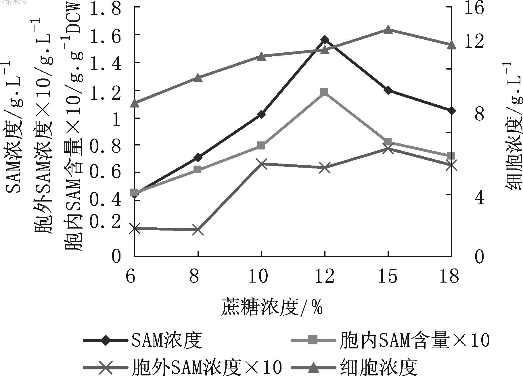 S-腺苷甲硫氨酸(S-adenosylmethionine,SAM),是存在于所有生物体活细胞中的重要代谢中间体,1952 年首先由Cantoni[1]发现。在体内,SAM由ATP和L-甲硫氨酸经甲硫氨酸腺苷转移酶[EC2.1.5.6] 催化合成。SAM能参与体内约35的种生化反应,是人体内最重要的甲基供体,并具有转硫和转氨丙基的作用[2]。20 世纪70年代后期,SAM 在欧洲是一种治疗抑郁症的针剂处方药。1990年美国FDA通过了SAM 的随机双盲法验证,1996 年批准柜台销售,1999 年SAM口服肠衣片和软胶囊成为美国畅销的营养保健品。多年的应用研究证明,SAM 对肝病、抑郁症、痴呆症、关节炎和空泡脊髓炎等疾病的治疗效果显著 [3]。我国SAM的开发尚处于起步阶段,对SAM的研究具有十分重要的意义。SAM的生产制备方法主要有化学合成法、发酵法和酶促转化法3种。在培养基中加入前体L-甲硫氨酸,酵母发酵合成SAM是目前主要的工业生产方法[4]。国内多家机构研究酿酒酵母发酵生产SAM [5-10],但目前尚处于实验室水平或工业化生产的初级阶段,国内尚无规模化生产的报道。本实验室对SAM发酵条件进行了优化研究。 1 材料 1.1 菌种及标准品 SAM高产菌株酿酒酵母LS101,由本实验室筛选保藏。 SAM 标准品(Sigma公司) 1.2 仪器 UV-2100型紫外分光光度计(上海尤尼柯仪器有限公司);Agilent 1100型高效液相色谱仪(美国安捷伦科技公司);TGL-20B-C高速台式离心机(上海安亭科学仪器厂);GBJT-7W型全自动发酵系统(镇江东方生物工程设备技术公司)。 1.3 培养基 保藏培养基(/L):蔗糖20 g,酵母粉10 g,KH2PO4 4 g,K2HPO4•H2O 2.6 g,MgSO4•7H2O 0.1 g,ZnSO4•7H2O 2.5 mg,MnSO4•4-6H2O 12.5 mg;pH自然;115 ℃下灭菌20 min;保藏菌种时加入20 %~30 %甘油,-20 ℃冷冻保藏。 种子培养基(/L):蔗糖50 g,酵母粉 10 g,KH2PO4 4 g,K2HPO4•3H2O 2.6 g,MgSO4•7H2O 0.1 g,ZnSO4•7H2O 2.5 mg,MnSO4•4-6H2O 12.5 mg;pH 6.0;115 ℃下灭菌20 min;固体培养基添加2 %琼脂。 摇瓶及发酵罐培养基(/L):蔗糖、酵母膏、尿素适量,L-甲硫氨酸 4 g,CaCl2 0.2 g,少量的磷酸盐和其他无机盐;pH自然;115 ℃下灭菌20 min。 2 方法 2.1 种子培养与发酵 二级种子培养:将冻藏种子接种到含有25 mL种子培养基的250 mL摇瓶中,温度30 ℃,200 r/min培养24 h,作为一级种子;按1 %~5 %的体积比将一级种子接种到种子培养基中,30 ℃,200 r/min培养12~24 h ,作为二级种子。 摇瓶发酵:5 mL种子接入含有100 mL发酵培养基的500 mL摇瓶中,温度30 ℃,220 r/min发酵。 发酵罐间歇分批补料发酵:取摇瓶培养的二级种子,按发酵罐工作体积的5 %~10 %接种到8 L全自动控制发酵罐中。调节转速和空气流量控制溶氧在30 %以上,发酵过程中流加NaOH控制pH 5.0左右,培养温度30 ℃,定时补加蔗糖和L-甲硫氨酸。 2.2 细胞浓度测定 1 mL发酵液离心得沉淀,沉淀的细胞用蒸馏水重悬,然后稀释到一定倍数,使A600nm 在0.2~0.8 之间,根据细胞浓度CX(菌体干重)与A600nm的工作曲线计算细胞浓度。 2.3 SAM浓度测定 本实验测定胞内SAM浓度和胞外SAM浓度,以每 克菌体干重(DCW)所含胞内SAM的克数作为胞内SAM含量(g/g)。 在3 mL 发酵液离心后的菌体中加入3 mL 1.5 mol/L 的HClO4,提取1 h 后离心,在菌体中再加入3 mL 1.5 mol/L 的HClO4 提取1 h,离心后合并上清,稀释一定倍数,HPLC分析得到胞内SAM浓度;稀释发酵液离心后的上清,HPLC检测得到胞外SAM浓度。 Diamonsil C18色谱柱(4.6 mm×250 mm,5 μm),流动相为:甲醇∶0.04 mol/L NH4H2PO4 +0.008庚烷磺酸钠(18∶82),柱温35 ℃,流速1 mL/min,254 nm 紫外检测。与SAM标准品比较计算SAM浓度。 2.4 蔗糖浓度测定 用改进后的DNS法测量蔗糖浓度。取1 mL 发酵液离心的上清,加入0.2 mL 6 mol/L盐酸沸水浴10 min,使蔗糖充分水解成还原糖。NaOH调水解液至中性,然后用DNS法测量还原糖浓度,对照绘制的标准曲线得到蔗糖的含量。 3 结果与讨论 3.1 蔗糖浓度 酿酒酵母合成SAM一般选用蔗糖为碳源。初始发酵液中蔗糖终浓度分别为6 %,9 %,12 %,15 %,18 %,酵母粉浓度为1 %,尿素浓度为1.5 %(过滤除菌,接种前单独加),其他条件同1.3和2.1。摇瓶发酵72 h,结果见图1。