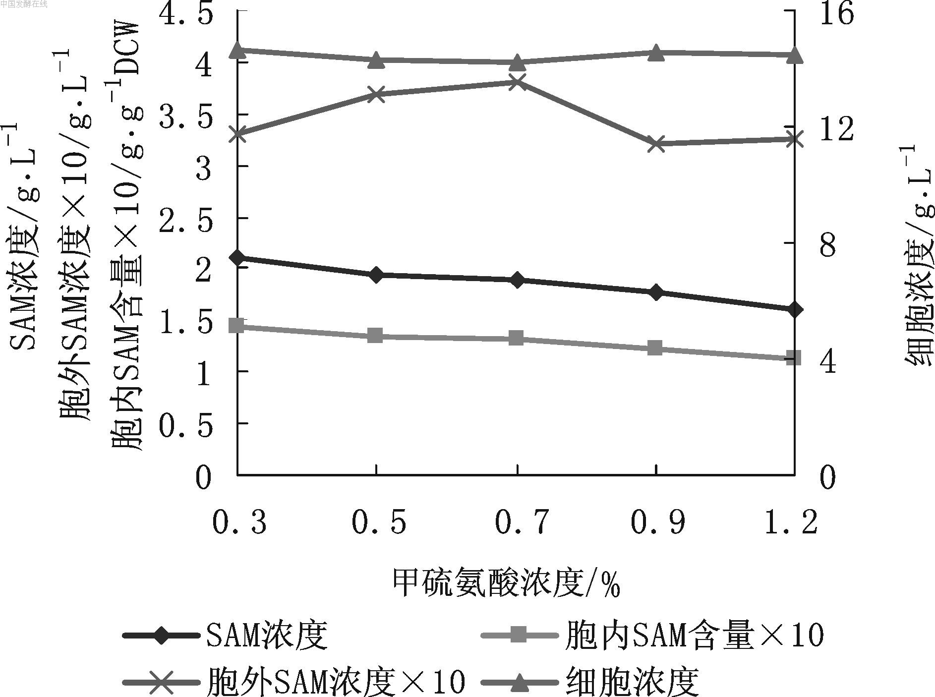 图2 L-甲硫氨酸浓度对SAM发酵的影响 由图2可见,SAM积累浓度随着发酵液中L-甲硫氨酸浓度的增加呈明显下降的趋势,从2.11g/L减至1.61 g/L;胞内SAM含量也呈相同的变化,从0.144 g/g DCW降至0.112 g/g DCW,但胞外SAM浓度和细胞浓度基本无变化。表明过高的L-甲硫氨酸浓度对甲硫氨酸腺苷转移酶有明显的抑制作用,导致SAM合成减少,因此应适当减低L-甲硫氨酸浓度。实验表明,L-甲硫氨酸浓度0.3 %~0.5 %较适宜,一般选用0.4 %,既不会明显抑制SAM合成,也能积累较高浓度的SAM。
