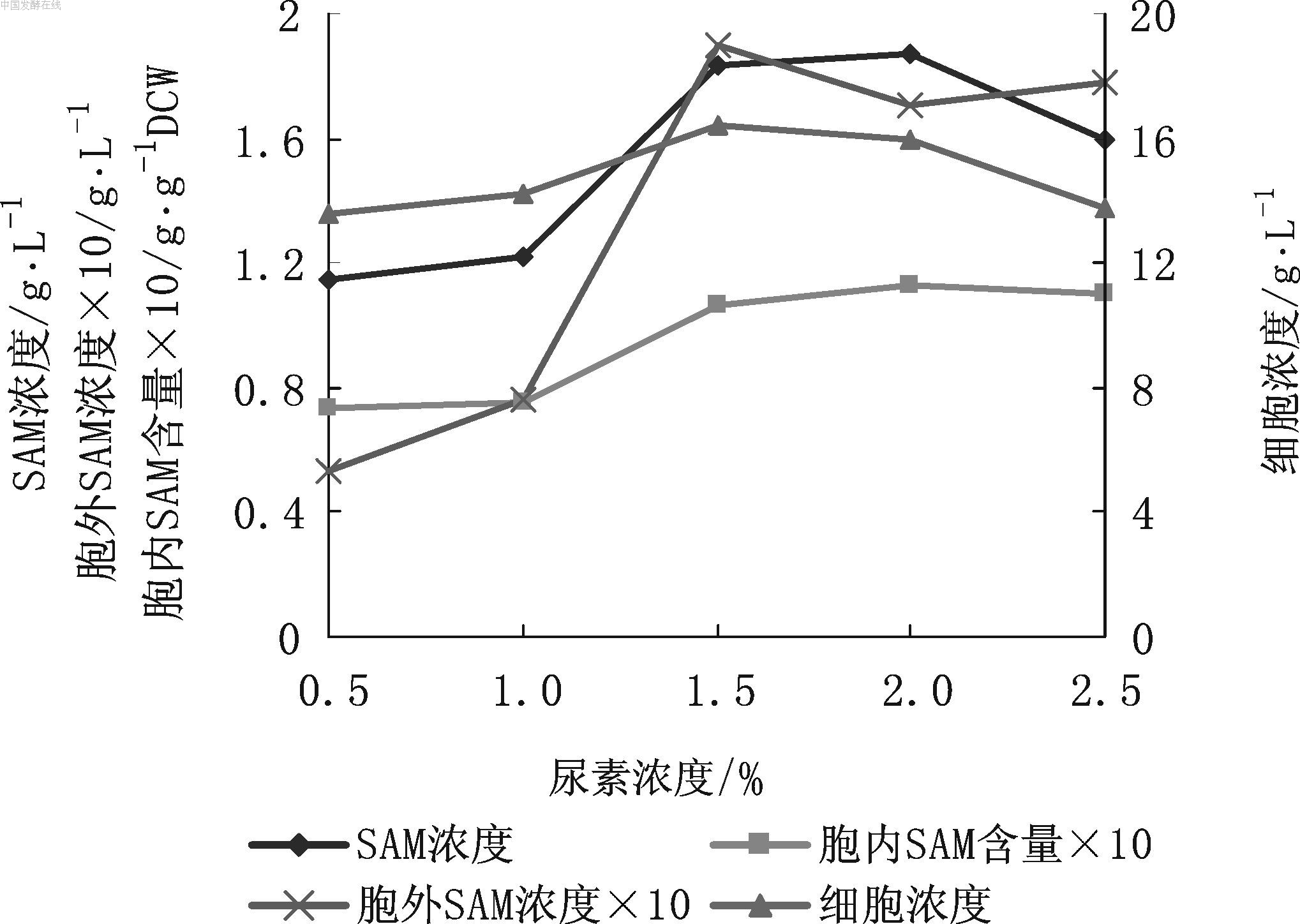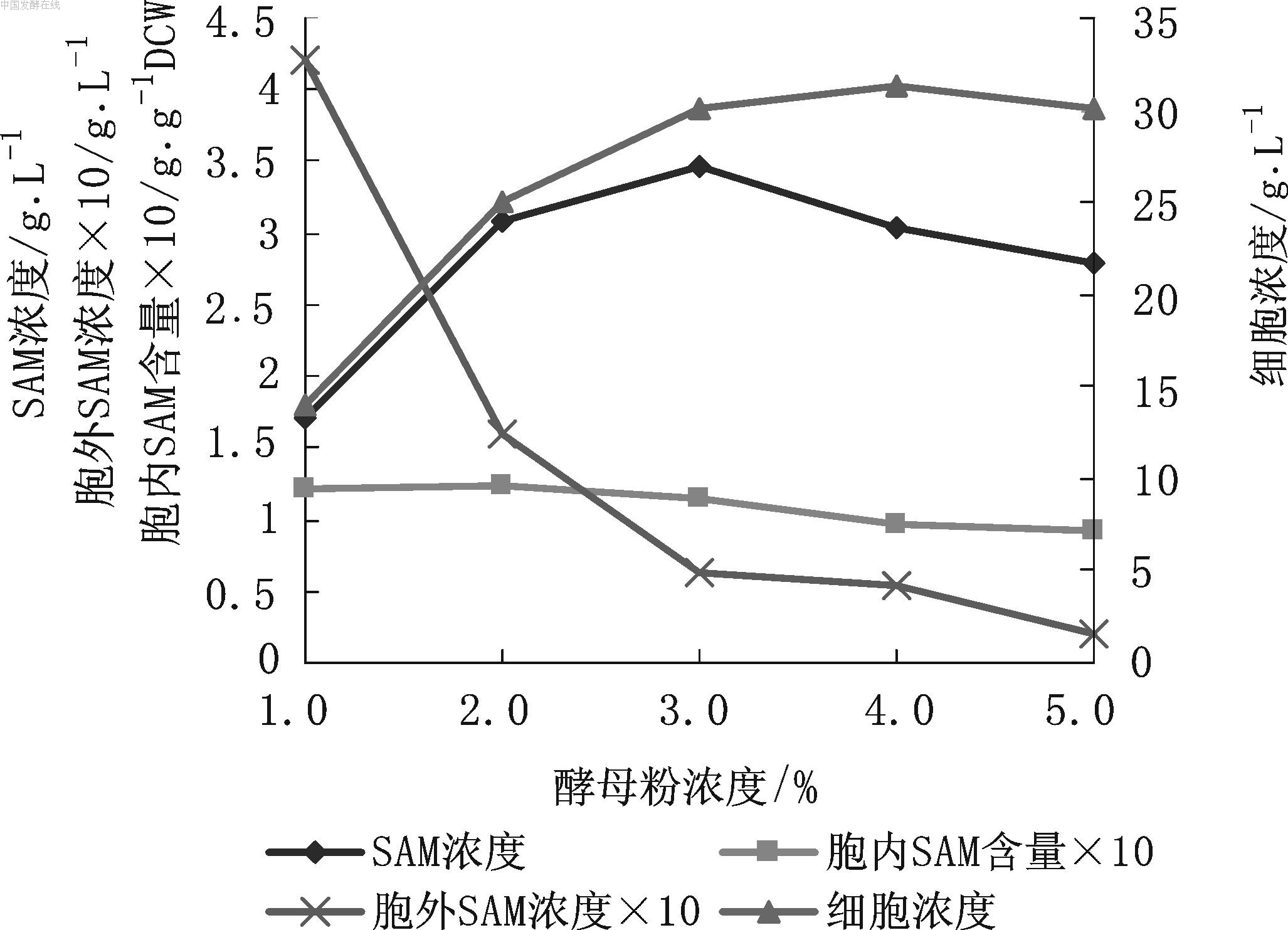 图3 尿素浓度对SAM发酵的影响 3.4 酵母粉浓度对SAM发酵的影响
