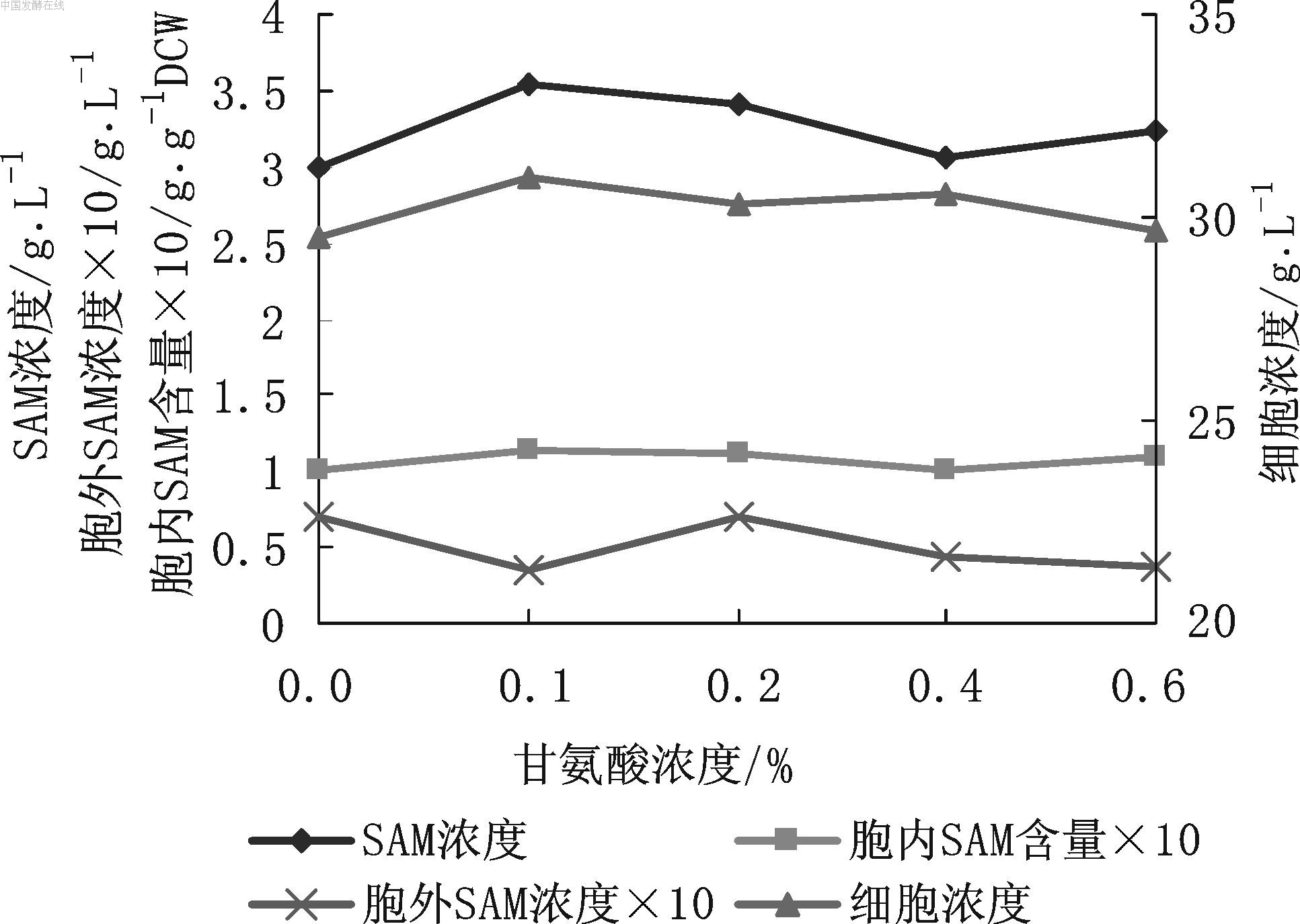 图6 甘氨酸浓度对SAM发酵的影响 由图6可见,添加0.1 %甘氨酸,SAM的浓度从2.98 g/L提高至3.54 g/L,胞内SAM含量从0.101提高至0.114,胞外SAM浓度也较低。甘氨酸浓度大于0.1 %时,SAM浓度反而小幅下降。添加甘氨酸对酵母细胞生长基本没有影响,故选用0.1 %甘氨酸浓度。