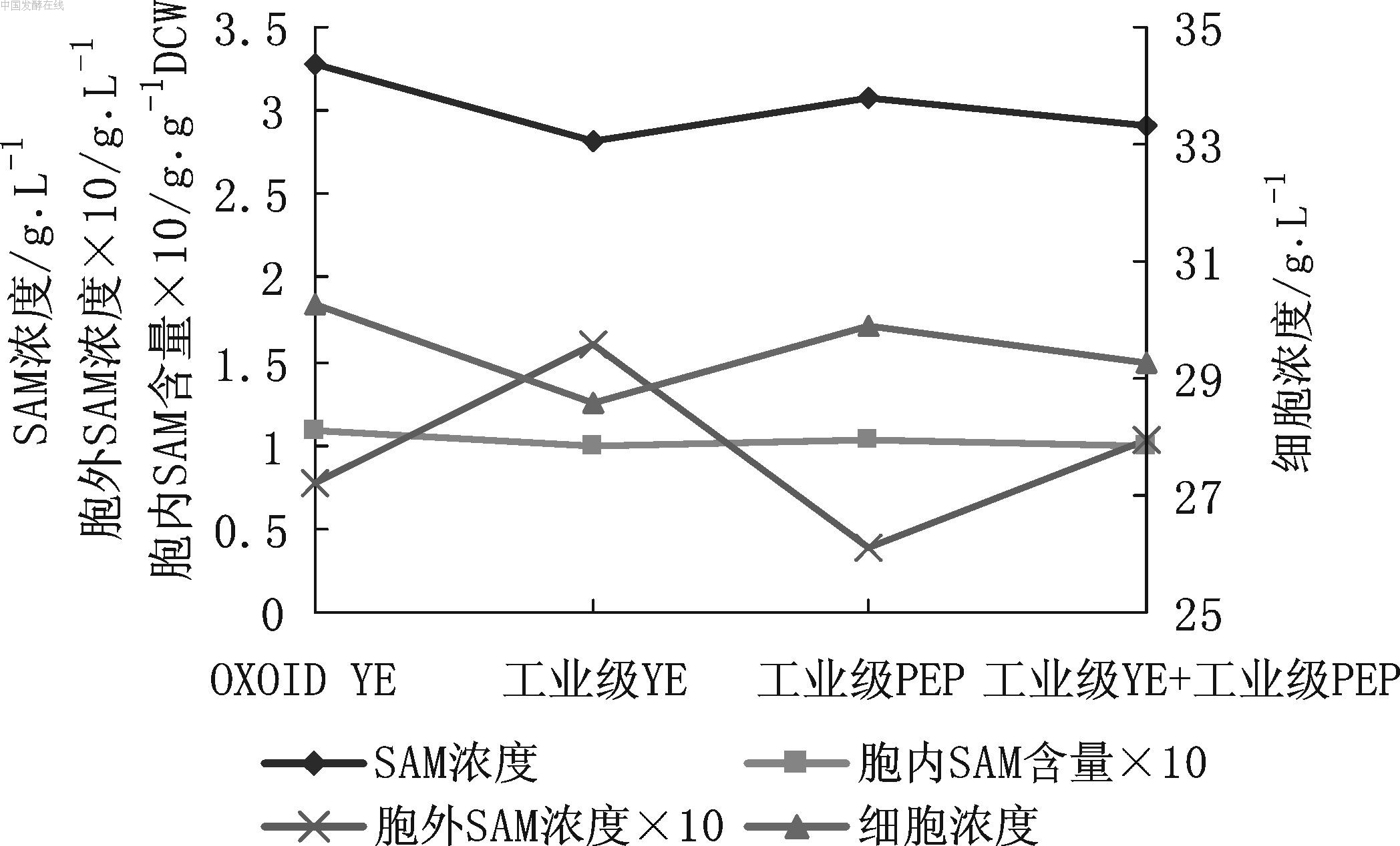 图5 4种有机氮源对SAM发酵的影响 YE: 酵母粉,PEP: 蛋白胨 由图5可见,Oxoid酵母粉的发酵结果略好于其他3种有机氮源(3.29 g/L vs 3.0 g/L),细胞浓度以及胞内SAM含量也稍高,但差别不大。工业级蛋白胨与Oxoid最为接近。考虑成本控制,可用工业级酵母粉或蛋白胨。