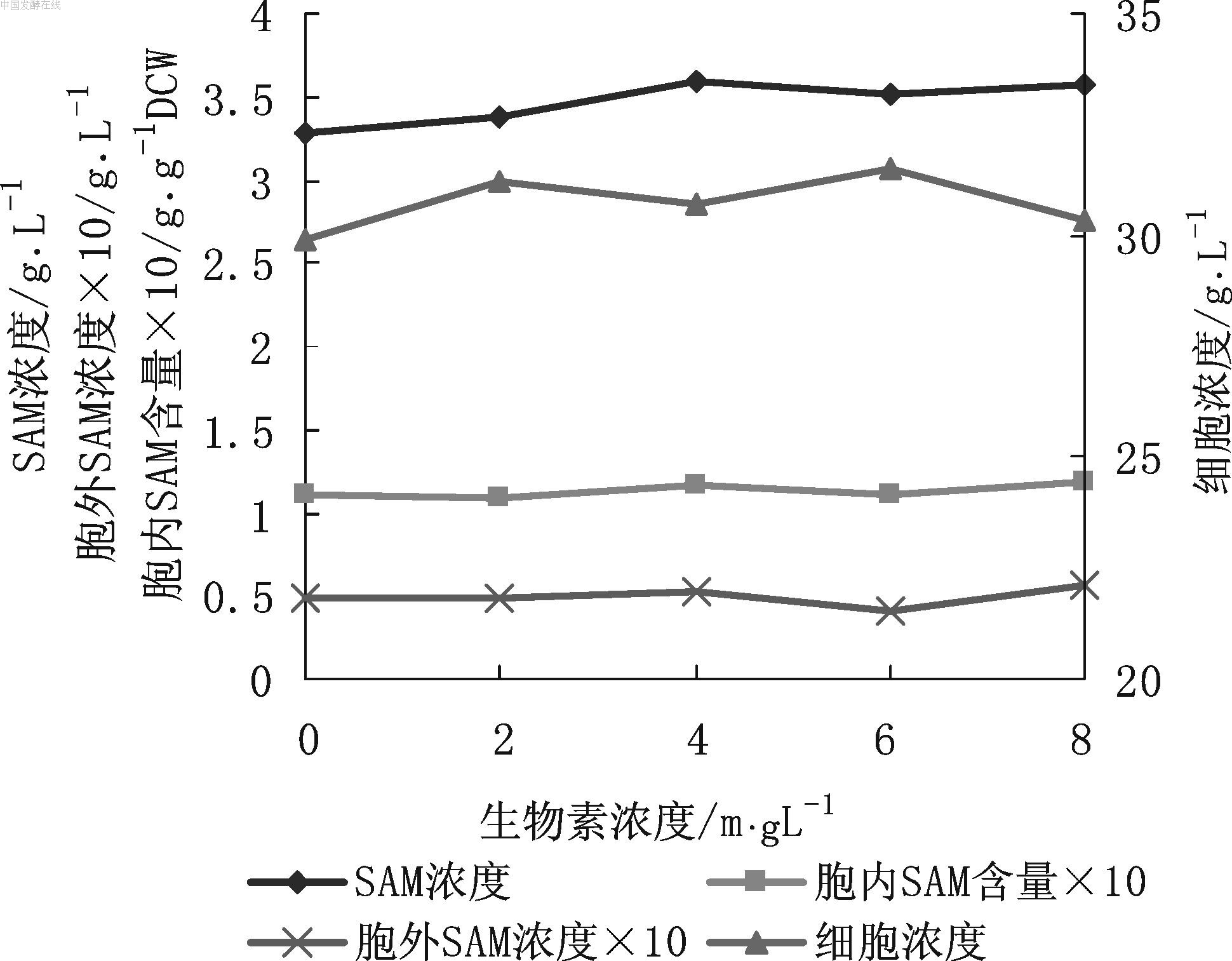 图7 生物素浓度对SAM发酵的影响 由图7可见,添加一定量的生物素后,SAM浓度和细胞浓度都有小幅升高,生物素浓度4 mg/L时SAM浓度最高(3.6 g/L);而胞内SAM含量和胞外SAM浓度变化不大。因而选用4 mg/L生物素浓度。