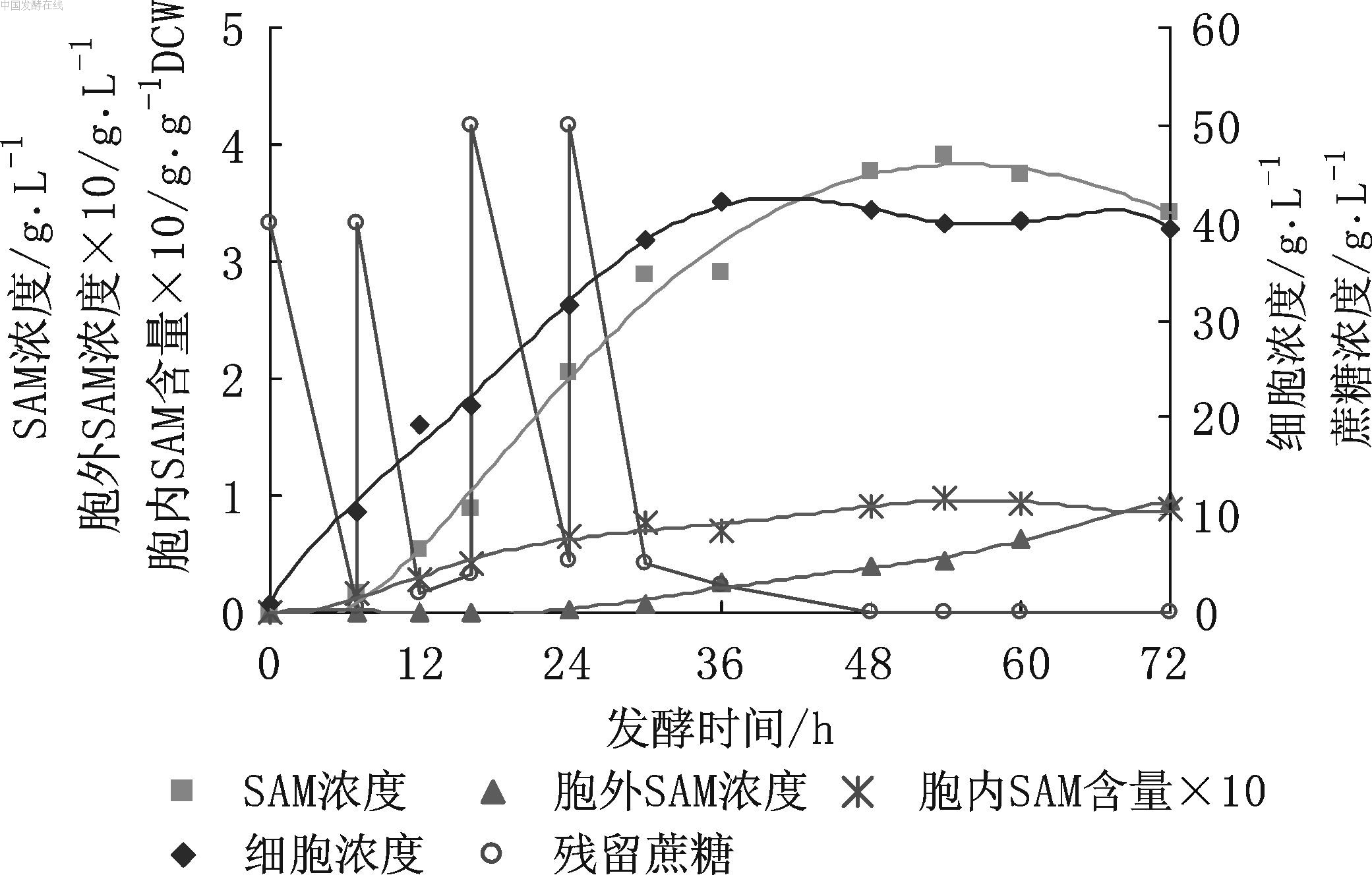 图8 8 L发酵罐上间歇分批补料时SAM的发酵情况 在上述实验基础上,以8 L发酵罐间歇分批补料发酵。补料策略为:尽量降低蔗糖和L-甲硫氨酸对SAM合成酶的抑制,分批定时补加蔗糖和L-甲硫氨酸。蔗糖补加过程为:发酵液初始蔗糖40 g/L,分别于8,16,24 h补加40,50,50 g/L,蔗糖用量总计为180 g/L;L-甲硫氨酸补加过程为:发酵液L-甲硫氨酸4 g/L,分别于16,24,30 h补加1.5,1.5,1.5 g/L, L-甲硫氨酸总计用量为8.5 g/L。其他发酵条件见2.1与3.7,发酵72 h,实验结果见图8。 参考文献 |