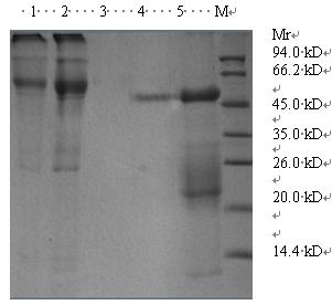 血清经 rProtein A纯化,收集各流出液进行SDS-PAGE电泳。经 rProtein A纯化后,在分子量为 55kD和 22kD处呈现两条带,分别相当于抗体的重链和轻链的分子量,证明血清经纯化可获得纯度较高的抗体,结果见图3。