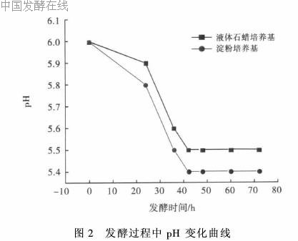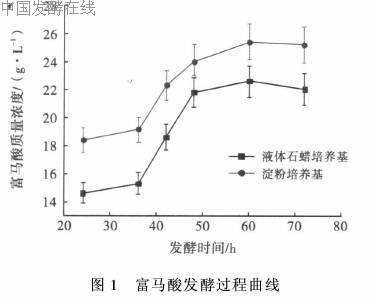 (3)用液体石蜡作碳源的发酵过程产酸量低于淀粉作碳源的发酵过程,可能是因为液体石蜡属烷烃类物质,与培养基的其他水溶性成分不能很好混溶,在振荡培养过程中发酵液出现了分层现象,使菌体不能很好地利用液体石蜡,从而表现为产酸量偏低.用淀粉作碳源的发酵液发酵效果较好,经短时间发酵后发酵液黏度下降,菌体生长旺盛,产富马酸较多.