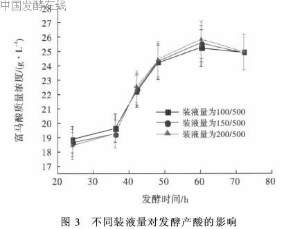 以可溶性淀粉作碳源,2%的接种量,不同的装液量(100 mL/500 mL,150 mL/500 mL, 200 mL/500mL)进行发酵实验,摇床转速为140 r/min,温度30℃,培养24 h后开始取样分析,富马酸含量随时间变化如图3所示.