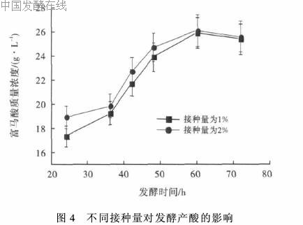 以可溶性淀粉作碳源,装液量150 mL/500 mL不同的接种量(1%,2%)进行发酵实验,摇床转速为140转/min,培养温度为30℃,培养24 h后开始取样分析,发酵液中富马酸的含量随时间变化的数据如图4所示.由图4可以看出接种量为2%时发酵产酸效果较好,较高的接种量有利于缩短菌体生长的迟滞期,有利于富马酸的生成.