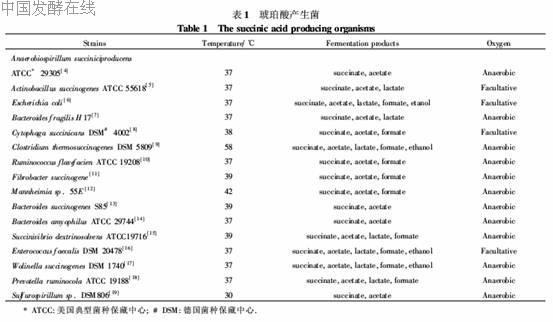 琥珀酸是一些厌氧和兼性厌氧微生物代谢途径中的共同中间物。丙酸盐生产菌、典型的胃肠细菌以及瘤胃细菌能够分泌琥珀酸。据报道一些乳酸菌(Lactobacillus)也能在特定的培养基上不同程度地产生琥珀酸[3]。表1列出了已经报道的产琥珀酸菌种及其基本生理特性。由于天然菌株的产琥珀酸能力非常低,发酵产物多种多样,对糖或琥珀酸的耐受性比较差而使其基本不具有使用价值。因此必须运用生物工程技术对现有的菌种进行造。目前主要的研究进展集中在产琥珀酸厌氧螺菌(Anaerobiospirillumsucciniproducens),产琥珀酸放线杆菌(Actinobacillussuccinogenes)和大肠杆菌(Escherichia coli)等菌种上。
