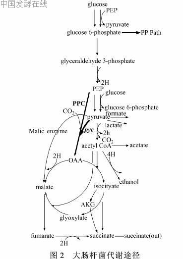 以葡萄糖为底物时,发酵产生琥珀酸、乙酸以及少量的甲酸和乙醇。与产琥珀酸厌氧螺菌相似,CO2对琥珀酸的产量有很大影响,还原性底物有利于琥珀酸和乙醇的发酵产生。能够利用外源氢气作为电子供体,并以富马酸作为电子受体[33]。一般条件下琥珀酸的最后发酵含量可达50g/L,当使用100%氢气时,琥珀酸的产量可达110 g/L[33]。Guettler等人[33,34]以产琥珀酸放线杆菌130Z(Actinobacillus succinogenesATCC 55618)为出发菌株,筛选出对单氟乙酸抗性的自发突变株。此菌株发酵产物中的琥珀酸/乙酸比例高达85∶1;琥珀酸/甲酸比例高达160∶1。在最适条件下,此抗性株的琥珀酸产量可以达到80~110g/L,发酵时间48h,得率高达97%。此菌株的主要研究工作由MBI (MichiganBiotechnology Institute)完成。目前还没有其他研究单位的公开文献。从MBI对于此菌的产酸特性研究以及代谢方面的研究中总结,产琥珀酸放线杆菌中包含有EMP、PP途径的关键酶,而且其磷酸烯醇式丙酮酸羧激酶、苹果酸脱氢酶和富马酸酶的活性明显高于大肠杆菌K-12[34]。Kim等[102]克隆并在大肠杆菌中表达了此菌的磷酸烯醇式丙酮酸羧激酶,当敲除原菌的磷酸烯醇式丙酮酸羧化酶后,琥珀酸产率增加6·5倍。虽然研究较少,但此菌株是迄今为止报道的耐高糖和高盐的菌种,已经具备初步工业化生产的能力[35]。